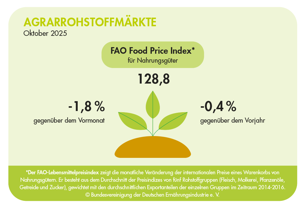 Im September sank der FAO Food Price Index auf 126,4 Punkten – ein Minus von 1,8 Prozent zum Vorjahresmonat. Vier der fünf Teilindizes gaben nach, wenn auch in unterschiedlichem Ausmaß. Am stärksten bei Zucker (−5,3 %), gefolgt von Milchprodukten (−4,1 %), Fleisch (−2,2 %) und Getreide (−1,4 %). Lediglich der Preisindex von Ölen stieg leicht um 0,9 Prozent.