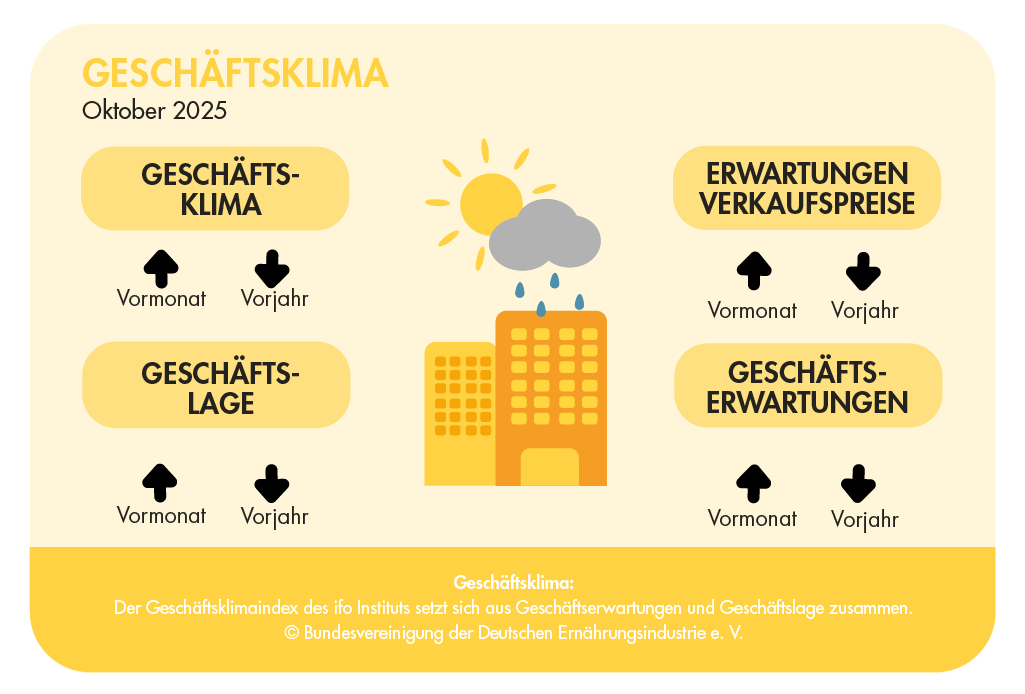 Der monatlich erscheinende ifo-Geschäftsklimaindex ist ein Indikator für die Stimmung und Erwartungen der Ernährungsindustrie. Die jüngsten Daten für Oktober deuten auf eine leichte Verbesserung des Geschäftsklimas hin. Der Saldo des Geschäftsklimas stieg um 6,7 Punkte und liegt nun bei 89,7 Punkten, jedoch immer noch deutlich unter der neutralen Marke von 100.