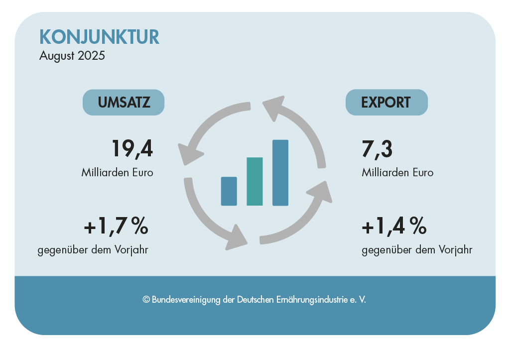 Die deutsche Ernährungsindustrie verzeichnete im August 2025 ein preisbereinigtes Umsatzminus von 2,5 Prozent im Vergleich zum Vorjahresmonat. Im Ausland ging der preisbereinigte Umsatz um 3,9 Prozent zurück, während das Inland einen Verlust von minus 1,6 Prozent verzeichnete. Nominal erzielten die Lebensmittelhersteller insgesamt einen Umsatz von 19,4 Milliarden Euro und damit ein nominales Plus von 1,7 Prozent im Vergleich zum Vorjahr. Im Inland belief sich der Umsatz auf 12,1 Milliarden Euro, was einem nominalen Anstieg von 1,8 Prozent entspricht. Das Umsatzergebnis im Auslandsgeschäft belief sich auf 7,3 Milliarden Euro und stieg nominal um 1,4 Prozent. Die Ausfuhrpreise stiegen weiterhin deutlich um 5,5 Prozent, während die Inlandsverkaufspreise im selben Zeitraum um 3,5 Prozent stiegen.